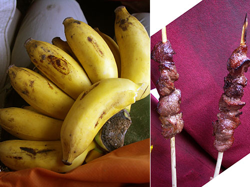 次にムバララという地名辺りからバナナ地帯になってくるはず。10時半ついにバナナ集団に遭遇。来る時は大きなバナナ1房でUs500だったのに今日はUs1000と言われ、モンキーバナナにした。隣の現地青年は私の倍以上の房をUs500でゲット。ずるいなぁ。でもま、とにかく1本食べてみて、その嫌味のない新鮮な味と香りに驚いた。こんなにおいしい果物だったっけ、バナナって。昼は牛串。やや固めだが噛締めるほどに味がある肉。満足。