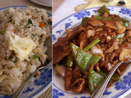 もう一品はチンジャオロースーと同じなのだが、細切り肉ではなく薄切り牛肉を使った料理。下味のついた牛肉に片栗粉をまぶして下茹であるいは下炒めしてあって、口に入れる度にトロミが含む味を楽しめる。葱やしょうがやにんにくの利いたオイスターソースが全体をまとめていてソースまで嘗め尽くしたい勢いで食べてしまった。シメは楊州炒飯。最後にだし汁をかけた、ふっくらしっとりなし上がりにうっとり。