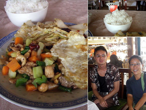 昨日の昼、中国人客が食べていた定食。ここでは弁当の注文を受けていて、その材料を使ってお任せ定食にしたものを、中国人シェフに直接注文するとしてくれるそうだ。この客がシェフを呼んでくれて、私たちにも出すよう話をしてくれた。で、今日から定食。カシューナッツと鶏の炒め、白菜の炒め、目玉焼きとご飯。うわー、おいしいし安い。今日は別の中国人とお友達に。中国にきたら連絡をくれとメールアドレスを書いてくれた。