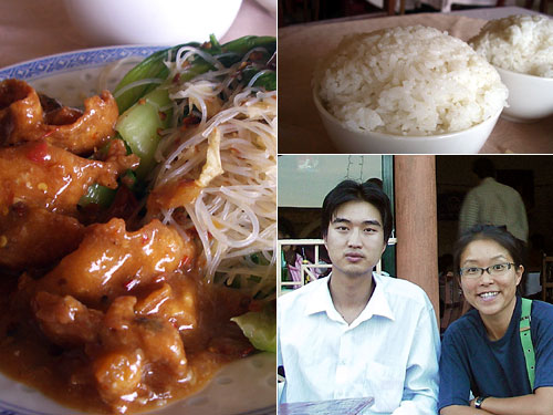 今日も厨房をのぞいてシェフを見つけて「ランチ、プリーズ」。ウガンダ人の女性ウェイトレスが「シェフは英語が通じないから中国語の話せないあんたたちの望みはかなわない」みたいなことを言っているが、そんなことはなかった。ちゃんとお弁当用のを店で出してくれた。春雨と青梗菜の辛味炒め、薄切り魚のから揚げ辛味噌ソース、そしててんこ盛りのご飯。ふー、お腹一杯です。若くて背が高くてカッコいいシェフと記念撮影。