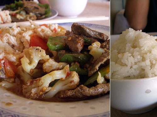 今日は2品。トマト入りのスクランブルエッグはにんにくの香りも高く、一人卵2つは使っているボリューム。こんな料理も中華なのかと驚く一品だった。そしてもう一品はレバーとピーマンと茹でカリフラワーの辛い炒め物。このレバーが全く臭みを感じない。素材が新鮮なのか、それとも下処理がしっかりしているせいなのか、レバーの濃厚な旨みだけが抽出されているおいしい料理だった。これに山盛りご飯。今日もおいしいお昼でした。