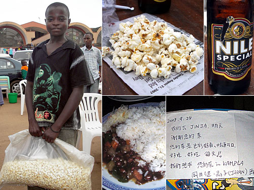流しのポップコーン売りの少年はとても恥ずかしがりだが礼儀正しく1人前を売ってくれた。これがまたカリッととてもおいしい。追加で2人前。お母さんのお手伝いなのだろうか。こういうのは胸にグッとくる。カンパラ最後なので夜も中華を注文したが、弟子の作品。似てもにつかぬ中華だ。シェフに感謝の手紙を書いて渡した。遠い目で「戻らないんですね」と言われ哀しかった。