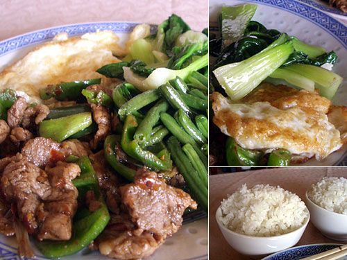 ここでの昼食も今日が最後となる。豚肉とピーマンの辛い炒めものはオイスターソースで味付け、塩茹でインゲンの炒めはにんにくを効かせてうっすら醤油味かなぁ?青梗菜の炒めは唐辛子とごま油の風味が効いている。同じような炒め物なのにそれぞれに味を違えているので、全て異なる料理として成立して楽しめる。これに目玉焼きとご飯がつく。シェフ、オーダー数間違いで怒りの罵声をあげるのは今日で3日目。いらだっていた。