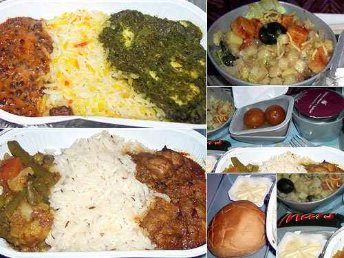 0時半に夜食。デリー行きはインド色満載。ベジメニューは豆のクリーミーなカレー。ホワイトソースのような濃厚さでおいしい。黄色いピラフ、ほうれん草と高野豆腐のようなカッテージチーズのカレー(あまりマサラの味がしない)、ノンベジは野菜のマサラ煮、ご飯、チキンカレー。前菜はひよこ豆とオリーブとベビースターラーメンの酸味ドレッシング。いい組み合わせだ。デザートは揚げパンシロップ漬け。甘すぎて一口でギブアップ。