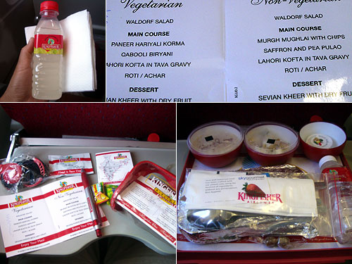 インドでは今雨後の筍のように新しい航空会社がどんどんできている。デリーからバラナシへはその中の一つ、ビール会社のキングフィッシャーが作ったエアーを利用。まずポカリスエットのような飲み物が出され、ビニールポシェットに入ったイヤホンとペンと航空スケジュール、ベジとノンベジにわかれたメニューリストが渡された。赤を基調にして統一されたデザインが可愛い。機内食はSky Gurmetという会社に委託しているようだ。