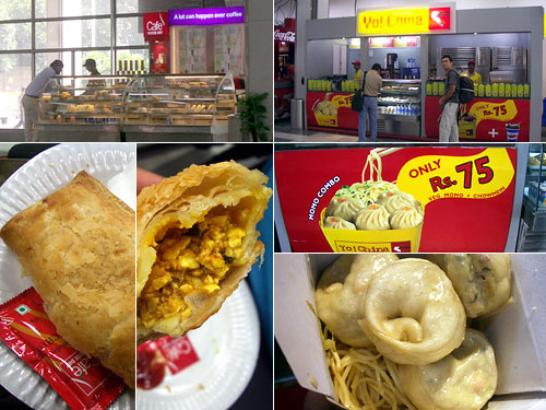 インドのデリーに到着し、すぐに国際線空港から国内線空港に移動。国内線のロビーに1軒だけある店はやや高級ベーカリーだった。全ての商品にベジタリアンとノンベジタリアンがある。ノンベジのパイはマサラ味のスクランブルエッグ入りだった。温めて出してくれ、生地もサックリして上等。チェックインして中のロビーでYo!Chinaというファストフードで餃子に似たモモと麺のセットを。モモがぱさついて今一つ。