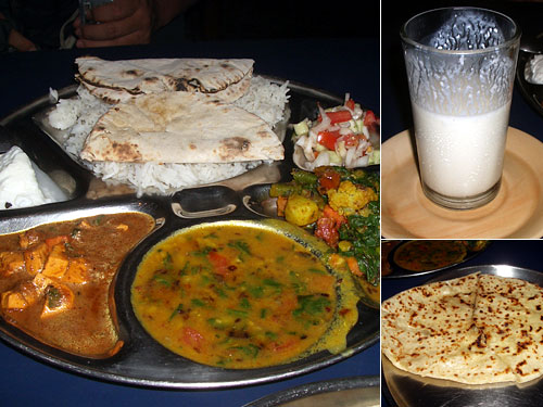 朝食がおいしかったので再びスパイシーバイツへ。定食のターリーは野菜のマサラ炒め、豆のスープ、カッテージチーズのカレー、ヨーグルト、ご飯、チャパティー、サラダ。Rs40で分量も多いし、これが一番お得でおいしいんじゃないだろうか。ラッシーはヨーグルトに氷と水を入れたものだそうで、お腹は壊さなかった。問題はナン。膨らんでいない。ナンがないのでチャパティーをナン型にして焼いたでしょう?やれやれ。