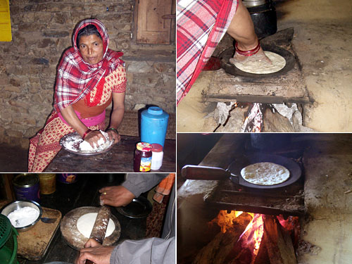 今日から8日間のトレッキングを開始。朝5時に宿を出て車で1時間、カーレに到着。そこから1時間13分歩いてオーストラリア・キャンプという場所で朝食だ。日本人観光客が多く訪れる宿の食堂では、民族衣装に身を包んだ女将がちょっと色っぽくテーブルに腰をかけてチャパティーを練り、普段着の旦那が伸ばし、女将がフライパンに乗せて焼いてくれるという仲むつまじい連携プレーでチャパティーを作ってくれた。