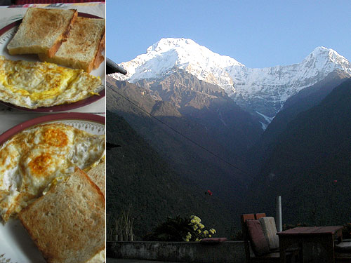 朝6時半、部屋の外を見ると昨日は曇って何も見えなかった山間の向こうにアンナプルナサウスがくっきり!なんと素晴らしい景色なのだろうか。早々に荷物をまとめて6時半から朝食。こんな山中でも食パンがあるのは驚きだが、下から運んできたわけではなく、チョムロンは割と大きな村なのでここで焼いているということで納得。標高2900mでこんな朝食とこんな景色を一緒に楽しめるとは思わなかった。