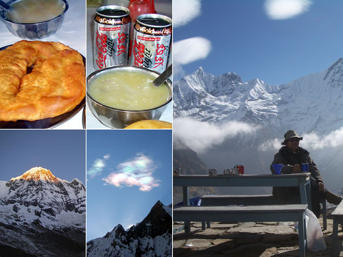 朝4時半にマチャプチャレベースキャンプを出て、6時10分の日の出をアンナプルナベースキャンプで迎えた。4130mの高山病対策には高価なコカコーラを。消化にいいポテトスープとあまり消化によくないけどグルングを恐る恐る。赤く染まるアンナプルナサウスを見て、マチャプチャレの上空で朝日に照らされた虹色の雲を堪能し、本命の「ヒマラヤでキリマンジャロコーヒー」を撮影。