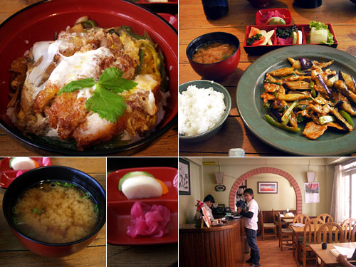 宿で割引券もらって行った店は、ネパールで日本語を勉強したという若者が日本語で接客してくれた。トンカツも日本の見た目そっくりで、だしがあまりきいていないのが残念だがバラナシよりはずっとおいしい。なす味噌炒めもいろいろおかずがついて楽しい。が、量は少なめ。定食のご飯などは子供用茶碗くらいしかないので1杯おかわり無料といっても男性には不足だろう。60代の客ばかりなのはそのせい?