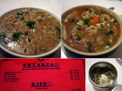 頻繁に行っているギリンチェにSHYAKPAシャクパというメニューがある。野菜スープにご飯を入れたシチュー、つまり雑炊だなと日本人ならピンと来る代物。出てきたのは、いつも注文している麺類のスープにご飯を入れて煮た、まさに雑炊だ。ああ、これに溶き卵入れてくれると最高なんだけどなぁと考える。でも・・・。これは白人が見たら絶対にゲ○想像して食べられないだろうなぁ。ああ、日本人で良かった。