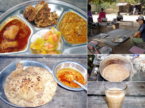 ターリーはジャガイモカレー、カリフラワーカレー、ダル(豆スープ、カレー味)、大根とトマトのサラダ、白米、チャパティー。おかわり自由だ。カレーは通常、個別に火を入れるが、まだ温かいので必要なしとマダムが判断したのかそのまま出た。アルーパコラはジャガイモ(アルー)をゆでてつぶして炒めた玉葱のみじん切りを和えたものがチャパティーにはさまっている。ダル(豆スープ)付き。かっらーい、でも旨い。