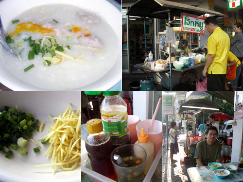 ランブトリ通りの東端のセブンイレブン前には深夜から開店して朝8時頃に閉まるお粥屋台があるというので、朝7時半に行ってみた。豚ミンチの団子入りの熱々お粥を生卵にかけるので、卵は半熟状態。これに刻み葱としょうが、ナンプラー(魚醤)、酸っぱい辛いたれ、好みで砂糖などを加えて食べる。出勤前のOLさんも買って行っている。ボリュームもたっぷりでとろっとしたお粥は朝にふさわしい。東南アジアにやってきた気持ちが高まる。