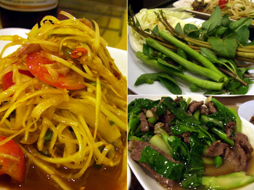 以前の会社の同僚の原田さんに今夜もお付き合いいただいた。ヴィクトリア・モニュメント駅近くはタイ北部のイサーン地方の料理屋が多く、昨日の屋台の5倍おいしいという原田さんの勧めで行ってみることになった。青いパパイヤサラダは昨日よりもずっと辛い。付け合せの野菜はキャベツ、インゲンに加えて香草。これはヨルダンでも食べた香草でこんな所で再会とは驚きだ。牛肉野菜炒めは普通においしい。