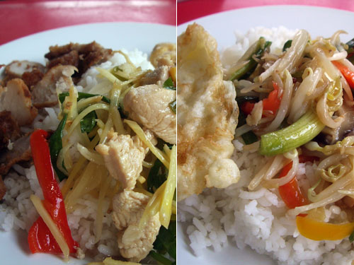 他の店を見てもこの屋台の価格と味を上回ると思えず、今日も同じ屋台に来てしまった。豚肉のローストの薄切り、しょうがとピーマンとにらと鶏肉の炒め物、目玉焼き、もやしとにらとピーマンと葱と豚肉の炒め物。どれも辛くない。タイ料理は辛いイメージが強かったが、ここは辛くない料理も多いし、店の人に聞くとどれがどのくらい辛いかを教えてくれる。ツーリスティックなカオサンだが実は他よりも安いらしい。