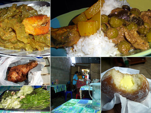 今日は別の店にいってみた。やっぱり初めてだと高く取られておかず2種でB50、1種でB40。私は苦瓜と海老で苦くて辛くてちょっと甘い。夫は大根と魚の煮物と牛肉と球形の野菜の辛い煮物。この店のはどれもココナッツミルク煮でものすごく辛い。球形の野菜は中に小さな種が入っていて少し苦味がある。前菜にチキンを1本、デザートにパン屋でカスタードクリームドーナツ。これが以外にもあっさりとおいしい。