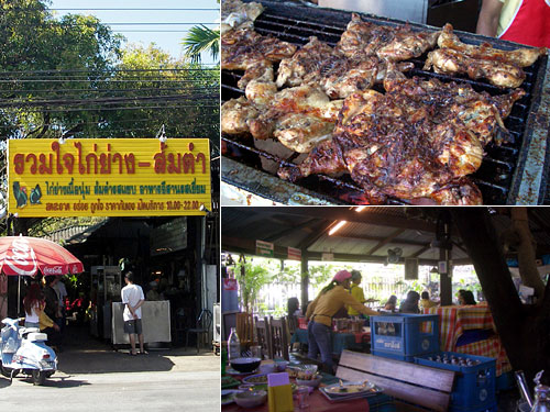 同じくCHAOに広告を出していた庶民派イサーン料理の店は、お堀西側のスアンドーク門から北上してセブンイレブンの手前にある。店頭で香ばしく鶏と豚首肉の炭焼きが煙を立て、店内はタイ人でいっぱい。外国人観光客は見渡した所一人もいなかった。日本語とタイ語のメニューを渡されて吟味。メニューがたくさんあって迷うのに、常連客に慣れているのか店員がせっついてくる。
