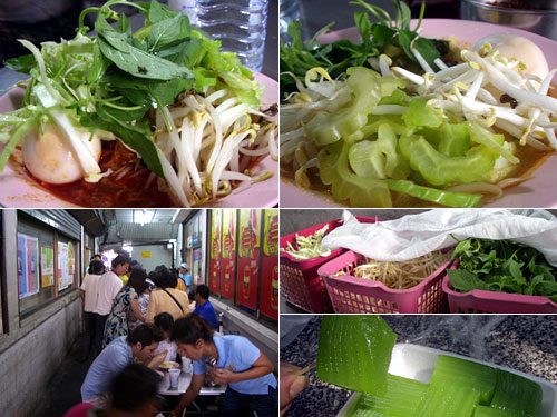 店と店の間の通路につくられた麺屋台。麺を選んで、スープ2種から選んでフィッシュボールとゆで卵の有無を告げると、その場でよそってくれてお勘定。お皿をもらって空いている席に移動する。卓上には生のもやし、バジル、苦瓜、キャベツなどがおいてあって、これを好きなだけ盛って食べる麺なのだ。野菜の甘み、半熟の卵が辛いスープに絡んで旨い、旨い。今日のノムシャンは固めで好みでなかった。