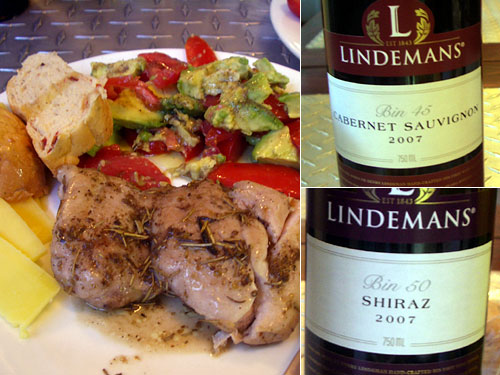 タイで出会ったタイ人とうまく会えずに宿で一緒に食べようと思っていたメニューを2人で食べることになった。チキンは塩・コショウ・ハーブで下味をつけてオリーブオイルでソテー。アボガドとトマトはざっくり切って塩・コショウ・オリーブオイルで和えた。パンはパプリカ入りのイタリアン。チーズはチェダーだ。オーストラリアの大手ワインリンデマンから2種類。シラーズの方がスパイシーで面白い。