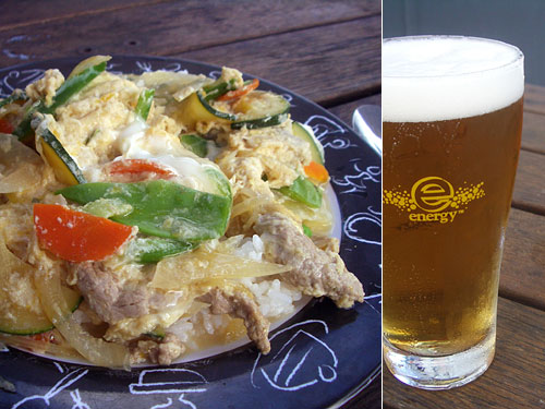 鶏のかわりに豚肉を使って他人丼。フライパンに多めの水、うどんだし、砂糖、醤油、塩でだし汁を作り、玉葱、ズッキーニ、絹さや、人参を入れて火が通ったら豚肉を加えて煮る。卵4個を流し込んでなべ底につかないように揺らしながら強火で煮あげて余分な水分をとばす。仕上げに卵2個(あまり溶かない)を上からそっとかけまわして半熟状まで火が通ったらご飯に乗せてできあがり。隣のドイツ人にも好評だった。ビールは軽い。
