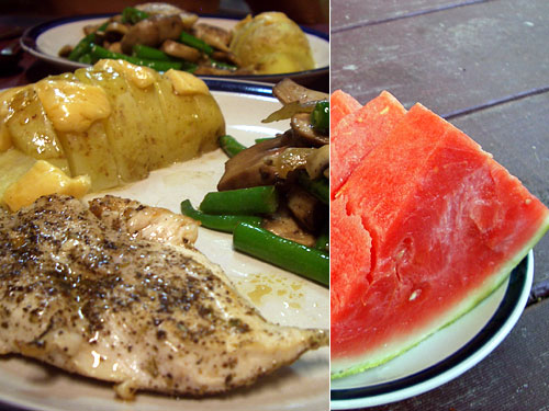 献立:チキン胸肉ソテー、ジャガイモチーズ、マッシュルームとインゲンのソテー