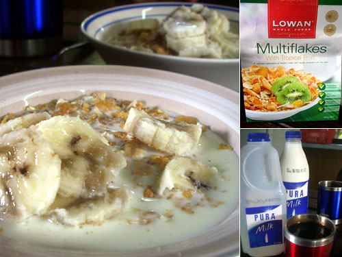 宿のフリー食材にあったコーンフレークはレーズン、オーツ(麦)なども入った食べ応えのあるミュースリータイプのフレークだった。ヨーロピアンはこれにフルーツをカットして牛乳をかけてよく食べているので真似してみた。コーンフレークだけよりも色々な味がしておいしい。牛乳がたくさん摂取できるのもいいしね。これからはミュースリーも朝食の仲間に入れてあげてもいい。日本だと高いがここなら手頃な値段だ。