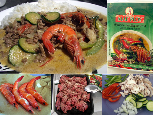 昨日入手したもう一つのグリーンカレーには海老を加えることにした。野菜類は電子レンジで柔らかくしておいて、炒めたミンチに加えて軽く炒めて取り出しておく。ペーストをフライパンで温めて香りが立ったらココナッツミルクを加えるのだが、昨日よりも随分多く余っていたのでクリーミーなカレーになった。そこに肉と野菜と海老を投入して10分煮たら出来上がり。海老の香りもするいい感じのカレー。それにしてもこのペーストは本当に辛い。