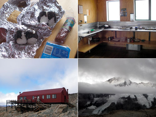 NZのトランピングではハットという簡易宿泊施設が用意されている。ミューラーは恵まれていてガスが用意されているが他では何もない場合もあるようだ。ベッド、シャワー、レストラン付きのネパールのトレッキングが初めてだった私たちには厳しい環境だ。鍋釜や食器を持ってくるのがわずらわしいので火を使わない手持ちの食事で済ます。夜には気温が0度くらいに下がり、温かい料理がうらやましかったなぁ。