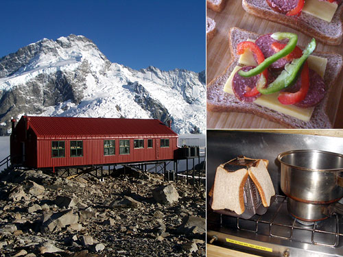 明けた朝は足元と同じ高さから下は雲に覆われているものの上は快晴。氷河のあるマウント・セフトンをバックにミューラーハットの赤い建物が映える。基本的に調理用具はないハットなのだが、誰かがおいていってくれた鍋2つとコンロにかけてトーストが作れる器具があり、トーストとお茶が作れたのがありがたかった。DOCはこれらの器具については管理せずということで、いつもあるとは限らないようだ。