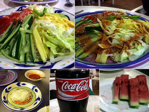 とにかく暑い。日中の気温は37度、夜もむーんと暑い砂漠のウルルでは辛い物、冷たい物が無性に食べたくなる。そこでタイレッドカレーの素(ココナッツミルクを加えるとカレーになる)を買ってきて水で溶き、お湯に2分つけるだけのビーフンにトマト、きゅうり、キャベツ、卵、ピーマン、チーズを乗せて変わり冷やし中華にしてみた。デザートはスイカ。これはいい。体は生野菜を求めていたようで、生き返る心地。