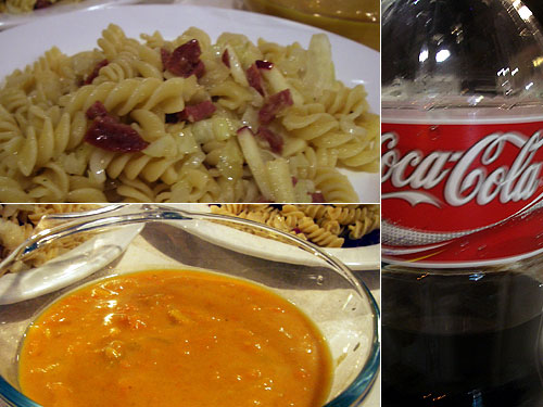 献立: 南瓜の冷たいスープ、キャベツとサラミのパスタ、コーラ