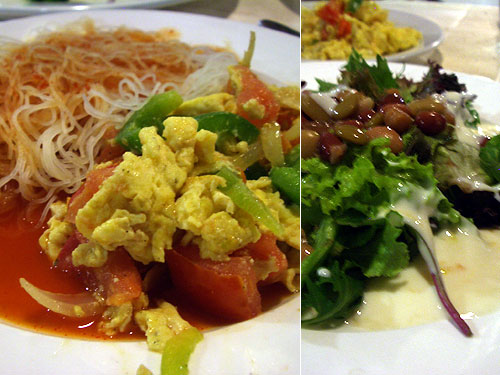 2分熱湯につけるビーフンにビーフブイヨンでのばしたコチジャンソースを絡めてみた。今一つ単純すぎて面白くない。炒め物はあらかじめ大粒の入り卵を作っておき、トマトと玉葱とピーマンを炒めて最後に卵を戻した。こちらはウガンダの首都カンパラにある中国人シェフの店で食べた物を真似たのでおいしい。同宿の高田さんから豆と様々な葉野菜のサラダを卵料理と交換。彩りのある食事となった。
