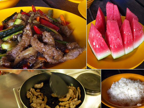 献立:牛肉と野菜の炒め、ご飯、水、スイカ