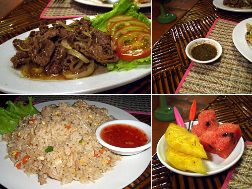 疲れて到着してビールを飲んだらバタンキュー。で、起きたらもう夜になっていた。宿は和食もあるがカンボジア料理もいくつか用意している。牛肉の炒めは味付けに醤油と少し砂糖とたっぷりの味の素を使っていた。これだけでも悪くないのだが、油と砂糖と醤油とレモンとコショウの付けダレがとてもおいしい。炒飯は中の野菜が冷凍なんかじゃなく生野菜を炒めていて当たり前に美味。フルーツが付くのが嬉しい。