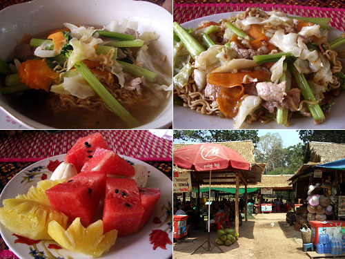 観光で訪れたアンコールワット遺跡群の一つバイヨン宮の前にある食堂で注文した麺類は全てインスタントラーメンを使っている。カンボジアでは普通のビーフン麺や中華麺よりもインスタントラーメンは高価ってことになっているらしいのだ。普通の麺を出してほしかったのに。味はどちらも甘めで味の素たっぷりだがそれなりにおいしい。でもやっぱり観光地値段で割高なのが気になるなぁ。フルーツはグッド。