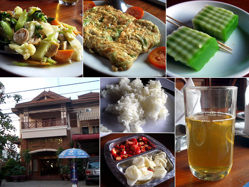 国道6号線沿いにあるバンテアイスレイは若くして亡くなったカメラマン一之瀬泰造氏もよく通っていたレストランだそうだ。もっと気取らない店だと思っていたら大層立派な店だった。お値段もやや高め。料理は普通においしいのだが、蓮の葉のお茶とデザートがついてくるのが嬉しい。そしてこのデザートがバンコクで出会ったノムシャンだったからより嬉しい。ココナッツ味のもちもちしたノムシャンは私の好物。
