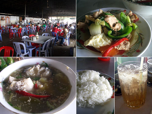 午後1時頃に再び30分の休憩。さっきヌードルを食べたのだがここで違うおかずを見ると見過ごせなく「とりあえず食べておこう」と夫婦で合意。こういう所はすぐに合意する。カンボジアの料理は大体において甘いのだが、この魚のスープは特に甘くてちょっと参った。お米は長粒米なのだが粘り気があっておいしい。ここでは氷の入ったグラスにお茶を入れた飲み物が付いてくる。くいーっと飲んで移動の続きだ。
