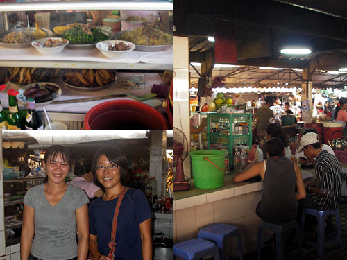 庶民の台所であるセントラル市場は食料品から雑貨から衣料品から果てはi-podまでとにかく幅広い品揃え。そんな市場の一角に小さな食堂が集まった場所がある。中でも青々とした小松菜風野菜の炒めが目を引くショーケースを置いている店で昼食を取ることにした。おかず一品とご飯で1ドルのところおかず2品とご飯で1.875ドル。いい値段だ。この国は1ドル以下は1ドル=4000リエルという自国通貨単位を使うので、ちょっとややこしい。