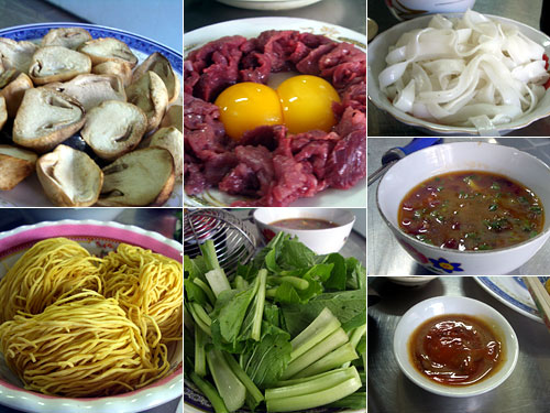 メニューは基本スープにアラカルトで具を選ぶようになっている。今日のきのこは袋茸のようなので食感も味もとても気に入った。牛肉と一緒に来た卵の黄身は麺用にとっておこう。名前だけでわからなかったのは平麺のビーフン。麺は別に中華麺を注文してしまったのでボリュームたっぷりだ。野菜は昨日ほどは面白くなく小松菜のような野菜が主体だ。溶き卵に甘辛いチリソースと牛肉を浮かべた物も付いてきて、このソースを鍋に入れる。