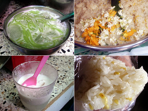 夫のはココナッツミルクのゼリー。下が半透明で上が白色。私のはツルっとして噛むとモチモチした食感がココナッツミルクの甘さと氷の冷たさと相まって心地いい。ゼリーもおいしい。旨いねぇ。残りの15円くらいはもち米に穀物を入れてふかしたのにジャスミンティーの香りのする花を散らしたものを100gほど。だいぶおまけしてくれて200gはあったよね。これがもう最高に気に入った。ほんのりもち米の甘さと油分のコクと花の香り。上級だ。