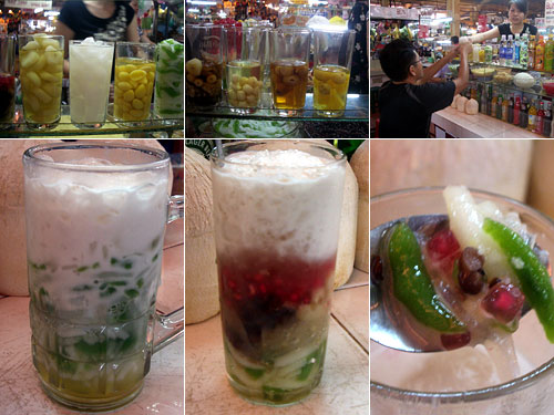 カンボジアでも楽しめた甘いおやつがここでも楽しめる。市場の食堂の一角には寒天や栗やクワイのシロップ漬けを入れたコップを並べている店がいくつかあり、そうした店でコップを選ぶとココナッツミルクと氷を足して出してくれる。確かチェーというデザートだったと思う。種類は様々でカンボジアと似た物も多い。しかし供し方がグラデーションを作ったりしてこちらの方が洒落ている。暑い場所なのですぐにチェーが恋しくなるのだ。