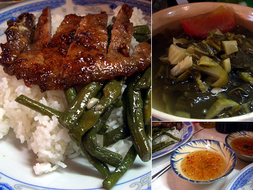 市場近くの眼鏡屋でメガネを作った帰りに市場で昼食。日曜日のせいで食堂街も店が閉まりがちの中、焼肉定食を食べている女性がいて、おいしそうだと見ていたら隣の店で注文したというので、同じものを頼んだ。火鉢のような簡単なものだがちゃんとした炭火で味付きの豚肉を焼いて、インゲンのソテーとご飯とスープが付く。肉はカルビの部分で脂がのって旨い。青梗菜のような茎のしっかりした野菜の漬物とトマトのスープも美味。