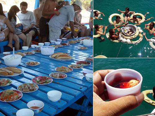 食事は船内の椅子を倒してテーブルにして行う。食事の後にはギターとドラムとガイドさんの歌声でダンス大会とカラオケ大会。暑くなったら海に飛び込んで泳いでいるうちにフローティングバーの時間となった。ローカル赤ワインにパイナップルを入れたものを海に浮かびながら飲む趣向だ。アルコール度16%と高く、飲みやすいのでついつい飲みすぎて私たちは二人とも二日酔いになってしまった。趣向としては楽しいツアーだ。