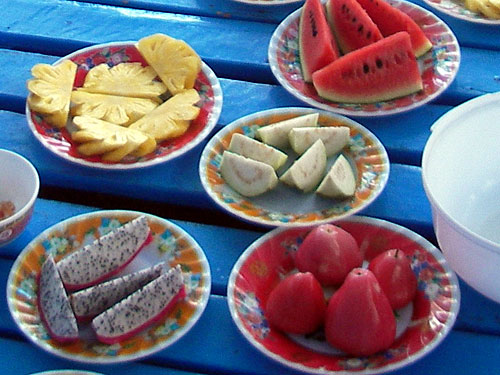 バーの時間帯が終わると卓上にはフルーツが並んだ。パイナップルとスイカはおなじみ。ピンクの肉厚な皮の中の白い実にゴマのような種が散らばっているのはドラゴンフルーツで薄甘い。ナスのように見える名前不明のフルーツはゴツゴツした緑色の表面の球状のフルーツでよく見かける。味はリンゴをぱさつかせたような感じだがさっぱりしている。トマト色のフルーツは中が真っ白な実でサクッとしていて甘酸っぱくてジューシーだった。