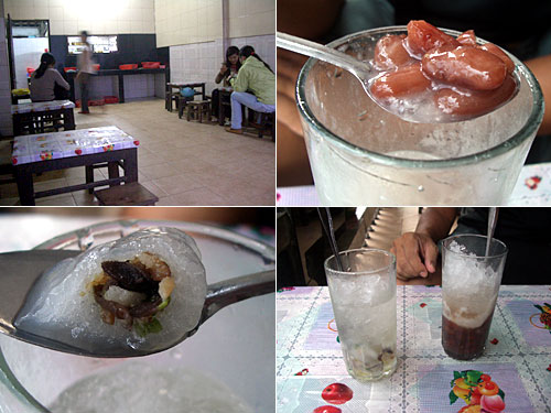 日本人が多く宿泊するビンジュアンホテルTのフロントには日本語で周囲の食べ歩きマップがはってある。そこに掲載されていて情報ノートでも評判のいいチェー屋はとても安い。店は裏通りにひっそりあるのだが、地元の少女や少年で常に賑わっていた。夫は小豆とココナッツミルク。私は餅が4つ入ったもの。餅の中には何と叉焼の細かく切ったものと葱が入っていてお食事的。餅を食べ終わって、甘い氷の汁を飲むと一食食べた気分?