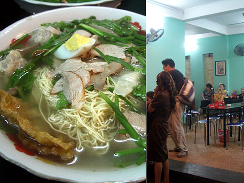 ハロン湾からのツアーから戻ると既に夜8時を回っていた。コムビンジャンで食べるほどお腹も空いていないし、向かいの麺屋でラーメンでも食べようと入った。メニューを見るのも鬱陶しいので、食べている人のを指差して同じものを持ってきてもらうと、ワンタン、叉焼、ゆで卵、揚げ湯葉、韮、パクチー、葱が乗った豪勢な麺。麺は黄色がかったストレート麺でベトナムでミー(中華麺)と呼ばれているものだ。あっさりしてなかなかおいしかった。