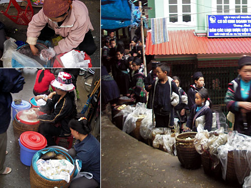 数日後にサパを出るミニバスを調査すべく朝5時40分に教会前に向かった。明けたばかりだというのに市場にも広場にも教会前にも人がいっぱい。何キロも離れた村から新鮮な野菜などを持って村人が大集合しているのだった。朝の市場ではそんな人に向けて様々な朝御飯が店を広げていた。そんな中でポリバケツにビニールを敷いて中にホカホカと湯気のたったおこわを売る人を発見。何て魅力的!早速私たちもこれを購入。