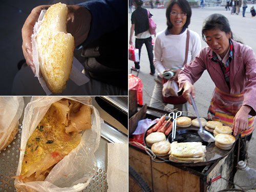 今日は石林という昆明から90km程西に行く観光地に行くために早く宿を出て、朝食が宿で食べられなかったのでバスターミナル付近の屋台で購入。大きな平べったい円形の餅を油で焼いたものは地元ではチリソースと砂糖をつけて食べるらしい。砂糖を拒否したら何もつけずに渡されたので味がなくて失敗。クレープ状のものは卵が落としてあるがこちらも味が薄い。うーむ、この屋台の品はどうやら失敗だ。