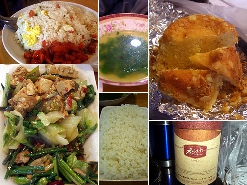 いつもいっている惣菜の店は炒飯やその場で作る一品料理の炒め物もやっている。今日は一番高級な揚州炒飯といつものお惣菜弁当一人前。揚州炒飯とはハムと卵と野菜が入っているのをこう呼んでいるらしかった。が、ハムが練り物っぽくて、もっと仕上げの白湯でしっとりしてコクがあるはずなのに全く違う。ここはお惣菜を食べているのが無難なようだ。ワインは雲南省香格里拉(シャングリラ)。今一つだ。